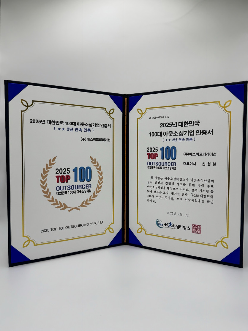 에스비코퍼레이션이 2025년 대한민국 아웃소싱 100대기업에 선정 되었습니다.