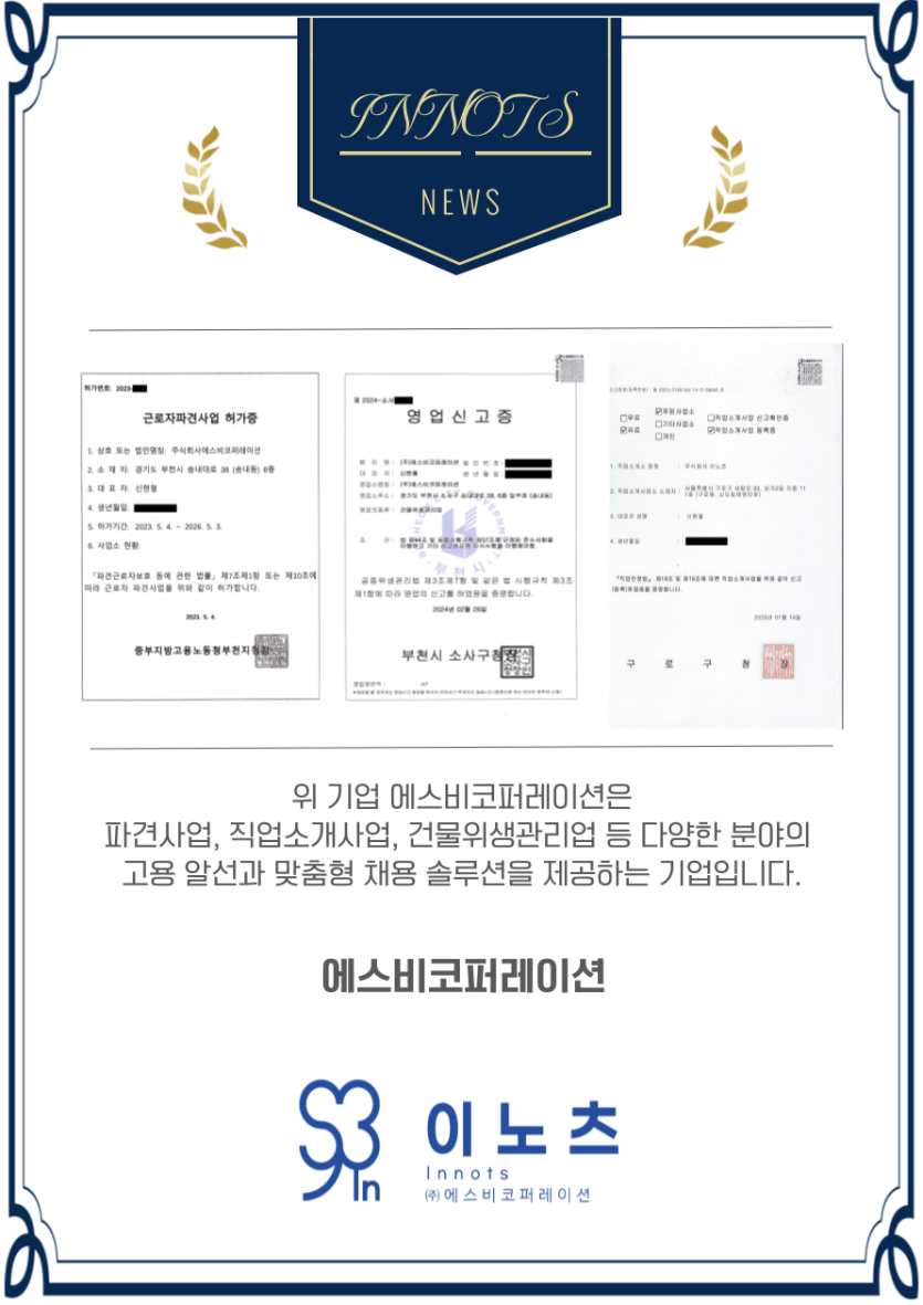 - 이전글에스비코퍼레이션 근로자 보호 HR서비스 클린기업 인증 25.04.16