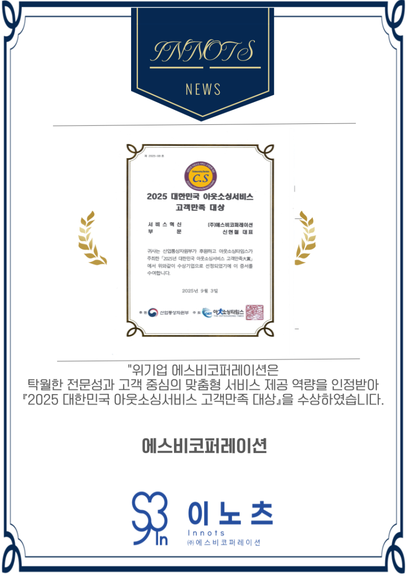 2025 대한민국 아웃소싱 서비스 고객만족 대상을 수상하였습니다.